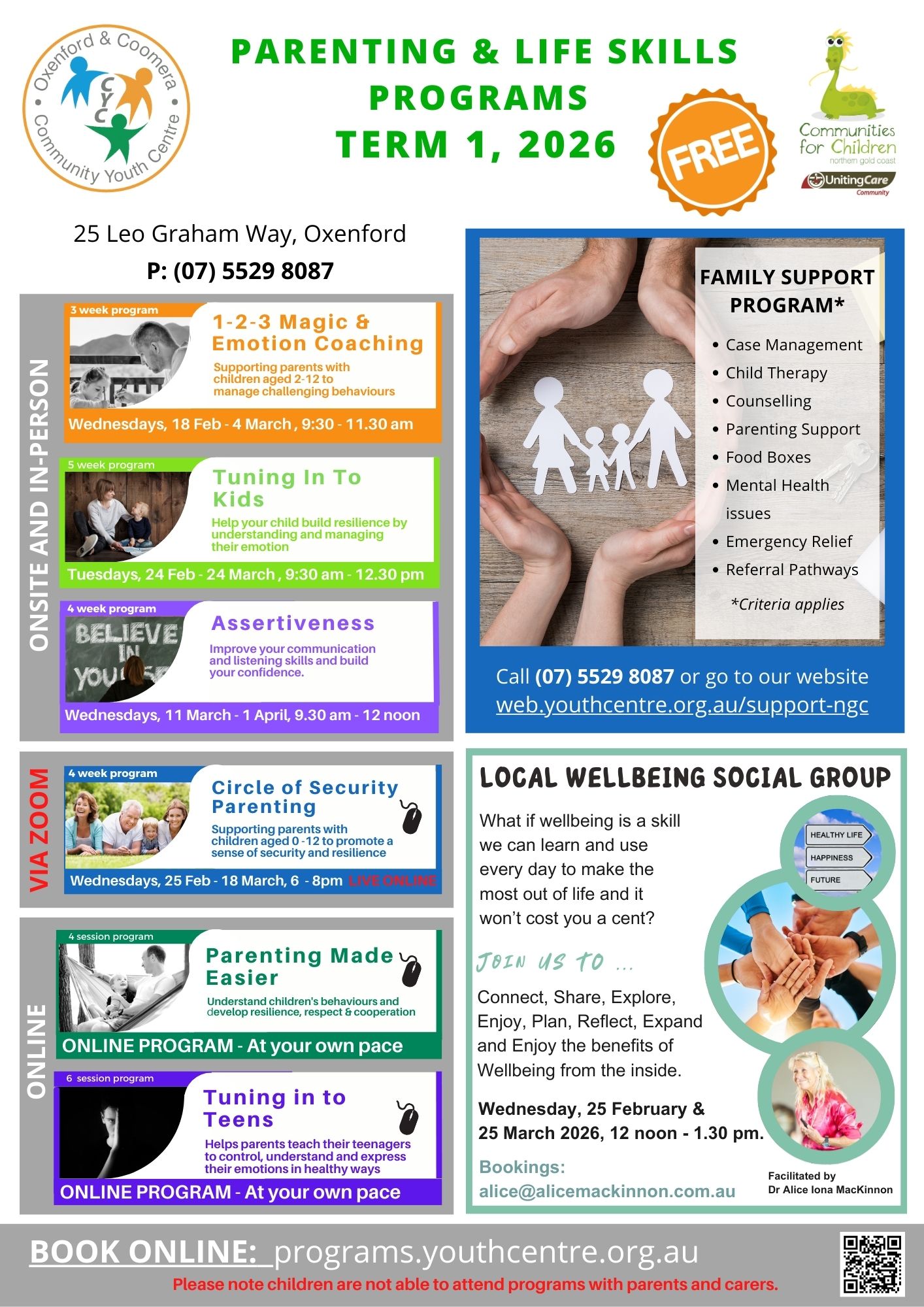 FREE parenting and self development programs. These programs rotate each school term. Make sure you book in if you would like to access the programs this term!