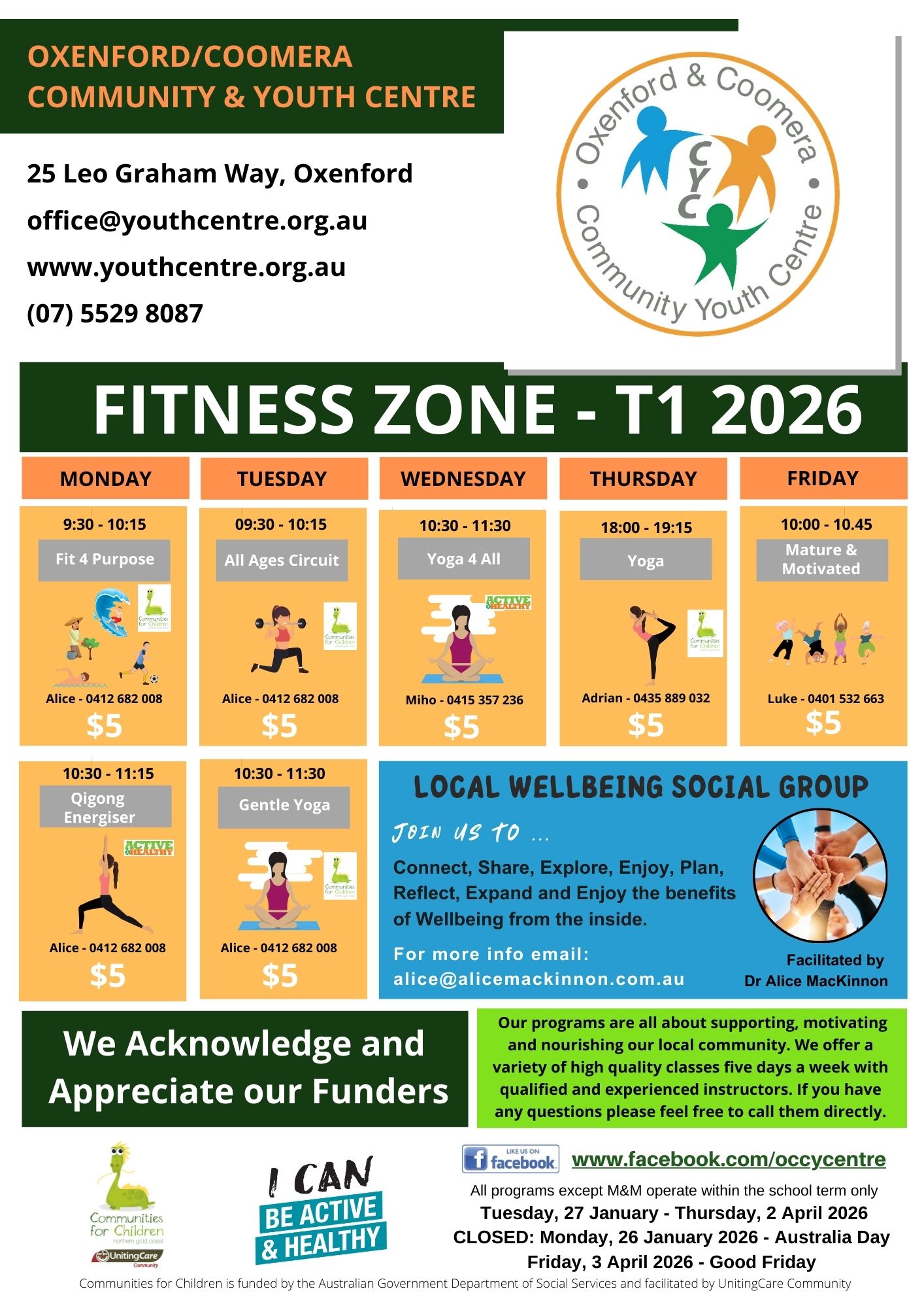 These programs are all subsidised to maintain low cost. Programs in orange are more physical wellbeing focussed, while programs in purple are more emotional wellbeing focussed. Contact the facilitator directly if you are interested or if you have any questions.